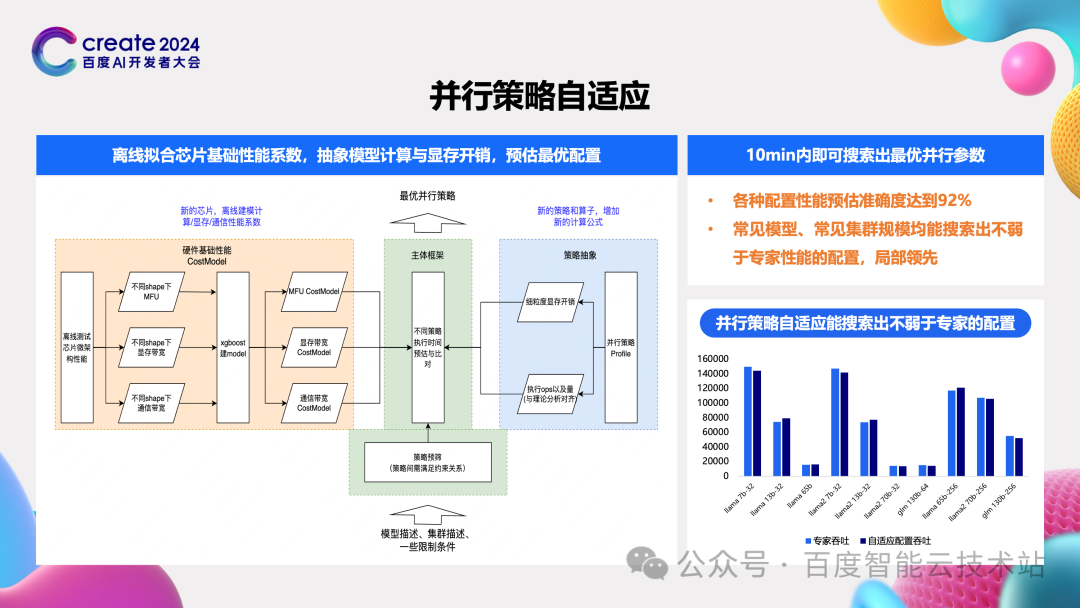 在大模型训练过程中,我们做的第三个方面的探索就是针对前面反复提到的,并行策略这么多,怎样配置才能获得最好的性能呢? 百度百舸给出的方案就是通过一套自适应的方法来预估出最优配置。核心思路就是三点: 第一点对于一个确定的切分策略,从理论上是能计算出每块卡上所分配的数据和参数的,这样我们就能很好的计算出每块卡上的计算量和所需显存容量。 第二点呢对于每个硬件,是可以通过离线测试来构建它的计算、显存访问、通信的性能模型。 第三给定一个模型和一个集群,我们是能穷举出所有可能的并行策略的。结合前面两点,我们预估出每种并行策略下的计算量以及芯片所对应的性能,那么每种并行策略,我们都能预估出他的执行时间,自然而然就可以选择出最优配置了。