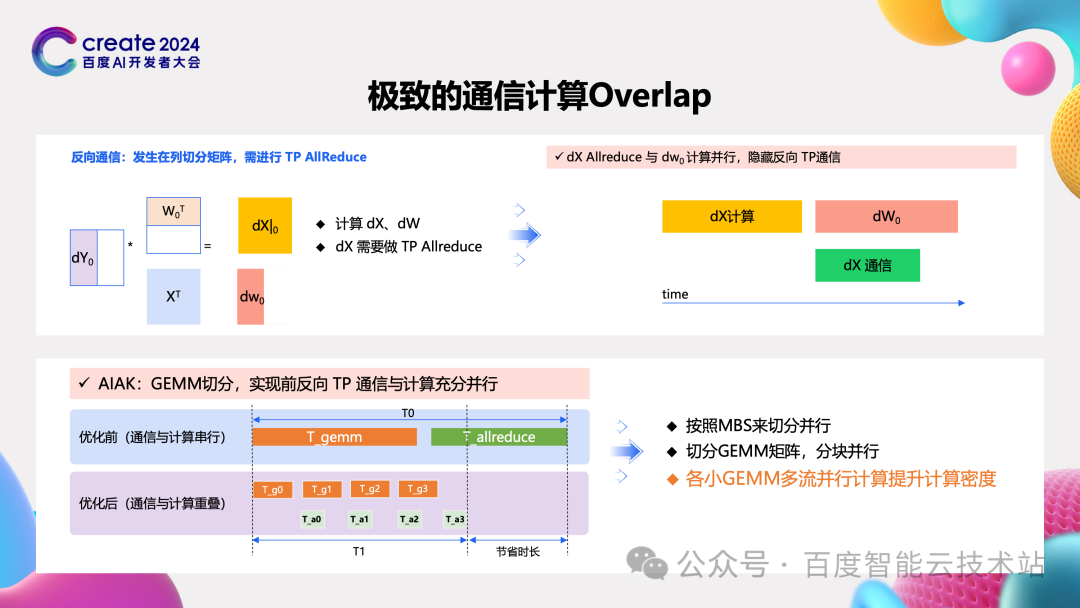 首先第一个问题 TP 通信占据时间长的问题。 在大模型训练过程中,其实不只是 TP 切分,在 DP 切分中也是这样一个执行范式,就是一个很大 GEMM 后面跟着同步的通信。由于这个通信是同步的,所以 GPU 的计算是暂停的。针对这个问题想到的最直接的方法就是将计算与通信做重叠。 针对 TP 通信,我们尝试了两种方法: 主要针对反向计算的过程。因为反向计算涉及到针对于输入和参数这两个维度计算梯度。所以我们将计算输入的梯度和计算参数的梯度分解开。当计算完输入的梯度之后,就立即发起相关的通信。这样的话,计算参数的梯度和这个通信就可以重叠起来。针对 GEMM 加通信这种执行范式,我们又进一步的去思考:是否像可以切分 TP 那样,把 GEMM 进一步切分成很多小块,计算一块通信一块,计算一块通信一块,这样后面的计算自然就可以重叠前面的通信了。 再进一步观察,我们切小了这些 GEMM 操作之后,其实会引入一个新问题。这个 GEMM 操作的计算密度太低了,MFU 反而不一定是能够得到一个很大的提升。所以我们又开始去尝试,去将几个小的 GEMM 操作并行的去执行。执行完后就发起相关的通信,这样没有通信的时候并行的执行计算 MFU 会比较高,有通信的时候,通信和 GEMM 重叠,通信也被隐藏住了。