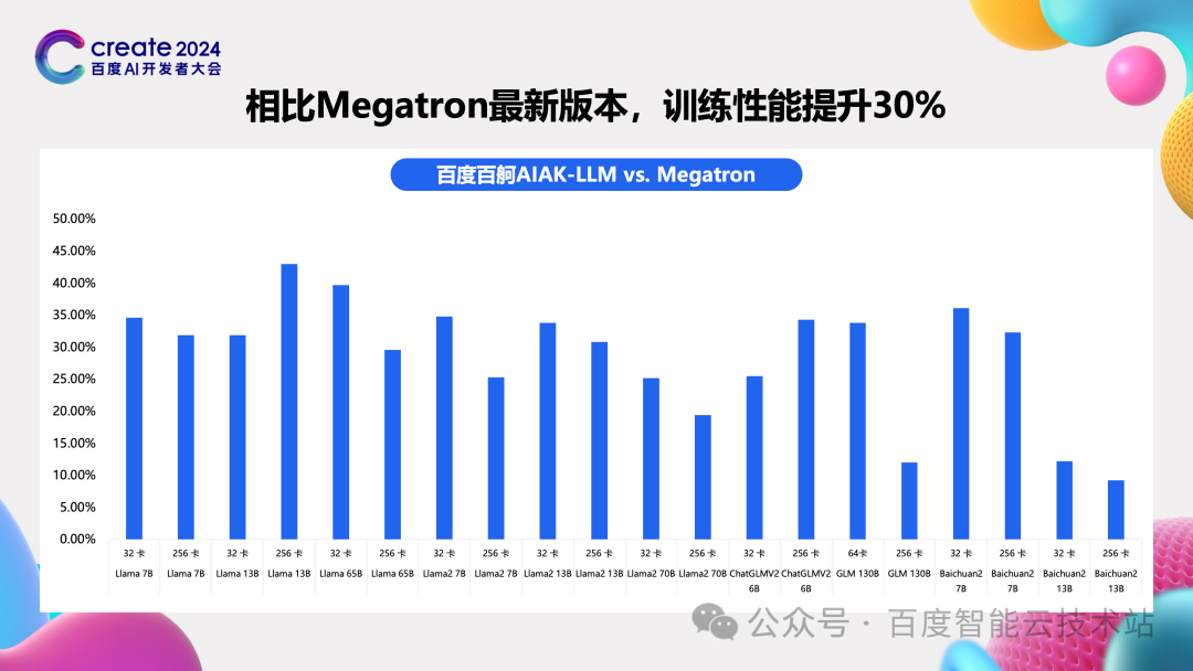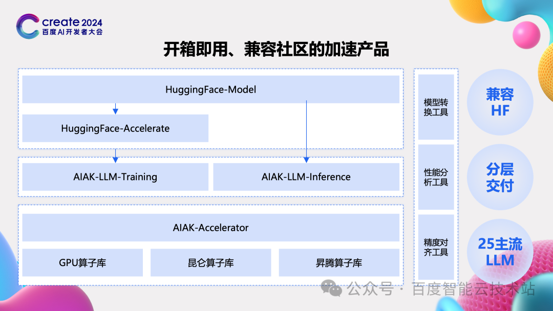 4产品介绍 前面的内容,我们用两个 case 串了一些我们觉得非常有意思的思考和优化。我们还有很多问题还在研究并持续提升我们训推的性能。 为了能让这些持续的研究成果被客户使用起来,我们在百度百舸的功能上做了很多工作。当前大家做模型研发都离不开一个社区 Hugging Face,大家的模型是从Hugging Face来的,早期的代码也是 Hugging Face 的,我们这种专有的加速工具对于早期客户来说往往遇到切换成本高的问题。我们做了两个方面的产品工作: 第一个方面将 AIAK-LLM 对接到 Hugging Face 的生态中,这样早期客户可以少量修改就将自己 Hugging Face 代码对接到 AIAK-LLM 上,或者通过分层交付的库对接到自己的框架中,快速评估相关性能收益。与 Hugging Face 相比,能获得比前面所说的 30%、60% 更大的性能提升。 第二个方面的产品工作就是正在完善三个辅助工具,checkpoint 转换工作能实现各种模型 checkpoint 的互转,一条命令即可。精度对齐工具能将 AIAK-LLM 上的计算值和 Hugging Face 上的计算值清晰地展示出来,并标记出计算值有差异的地方,再针对性分析。性能分析工具更好地展示各个阶段时间开销,便于客户进一步优化。 通过 Hugging Face 对接,完善的辅助工具,再加上百度百舸原生适配好的 20 多个模型,我们期望能做到客户开箱即用,快速对比、使能和二次开发自己的产品。
