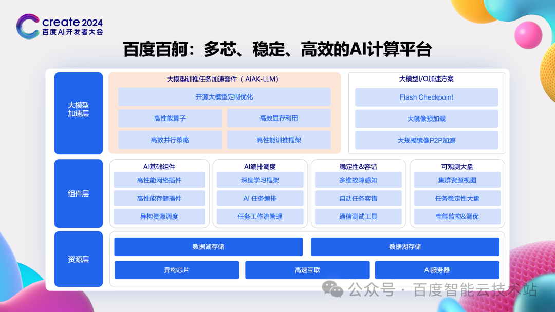 百度是国内最早探索大模型的公司,所以在公司内部,针对前面所说的规模、稳定性、训推成本等问题,很早就有关注到并有了非常多的沉淀。基于过去多年在 AI 方面的沉淀,百度智能云推出了百度百舸·AI 异构计算平台这个产品。到现在已经发展到了 3.0 阶段,全面释放出大模型相关的能力。 百度百舸主要分为三层: 最底层是资源层,提供大规模、稳定、成本优异的计算、存储等适合异构计算的基础云产品。 中间层是组件层,提供支持大模型训推的各种调度组件、容错组件等,支撑大规模的训练和推理任务,并保持稳定运行。 最上层则是大模型加速层,提供了计算、I/O 等丰富的加速能力,帮助大家把算力的效率发挥到极致。