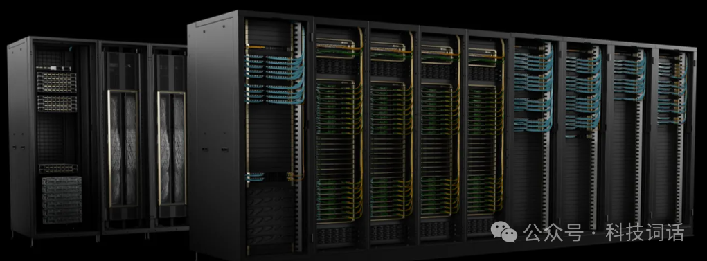 此外,黄仁勋还发布了由36个Grace CPU和72个Blackwell GPU组合而成的服务器GB200 NVL72。它将36个CPU和72个GPU插入一个液冷机架中,总共 720petaflops。GB200 NVL72内部有近两英里长的电缆,共有 5,000 根单独的电缆。GB200 NVL72