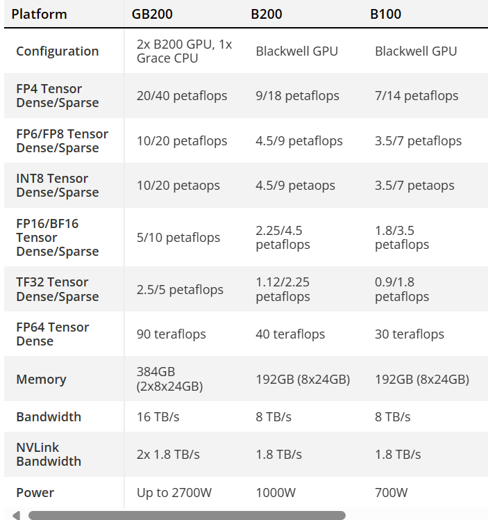 其中B100可以认为是B200的青春版,是Blackwell架构中比较强调性价比的一款GPU,B100一个很大的特点是,它维持了跟H100一样的功耗,都是700W,所以在跑训练的时候,一定会出现降频的情况。