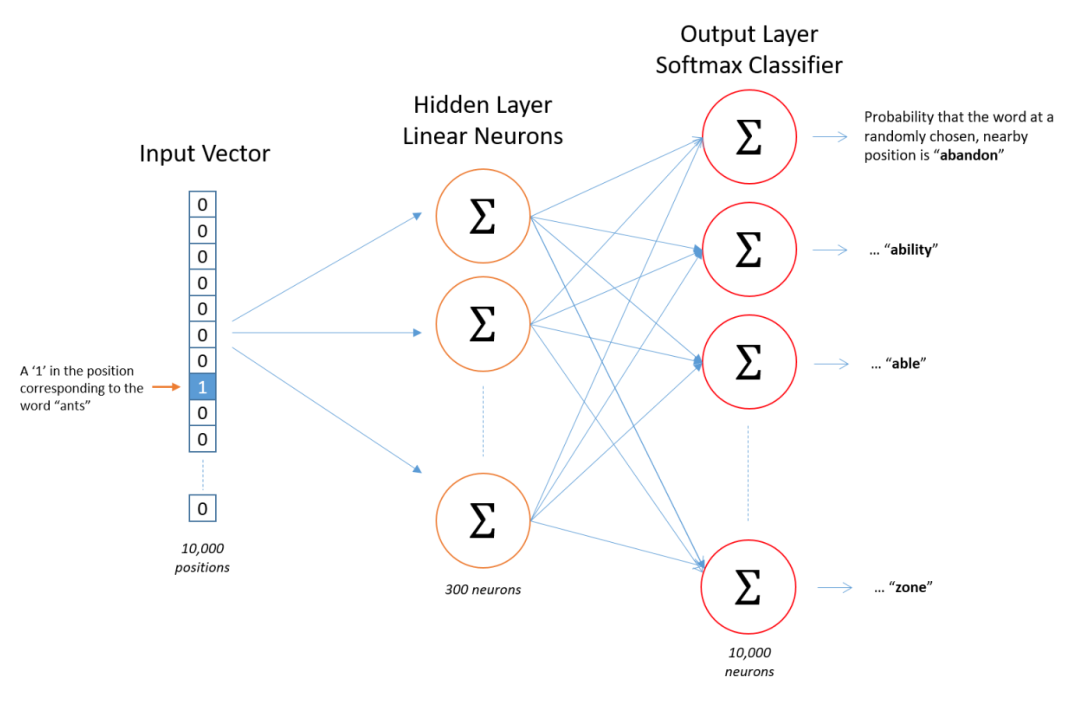 目标是最大化目标单词在上下文下的条件概率。使用 Softmax 函数计算概率