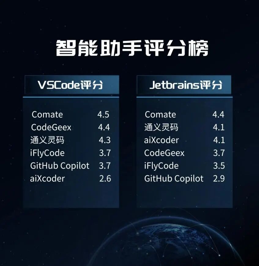 近日,在VSCode、Jetbrains等各大插件市场智能助手评分榜中,百度Comate分别以4.5和4.4位列第一,通义灵码位居第二、第三, CodeGeeX、iFlyCode、aiXcoder、GitHub Copilot等跟随其后。