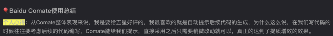 许多使用过Comate的朋友,都纷纷点赞,有人说它的代码提示功能,加快了软件开发的速度,并且提升了代码质量。