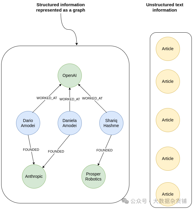 结构化信息和非结构化文本之间具有明确链接的知识图谱 在知识图谱中,您可以从 Prosper Robotics 节点开始,遍历到其创始人,然后检索提及他们的最新文章。 知识图谱表示有关实体及其关系的结构化信息,以及作为节点属性的非结构化文本。您还可以使用命名实体识别等自然语言技术将非结构化信息连接到知识图谱中的相关实体,如 MENTIONS 关系所示。