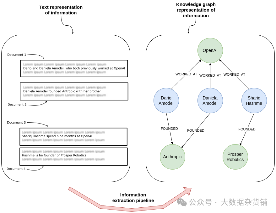 相似性搜索可能返回重复信息的示例,而其他相关信息可能由于检索到的信息数量或嵌入距离较低而被忽略 很明显,普通向量相似性搜索无法满足多跳问题。但我们可以采用多种策略来回答需要来自不同文档的信息的多跳问题。 知识图谱作为压缩信息存储 如果您密切关注 LLM 领域,您可能已经看到了压缩信息以使其在查询时更易于访问的技术。例如,您可以使用 LLM 提供文档摘要,然后嵌入和存储摘要而不是实际文档。使用这种方法,您可以消除大量噪音,获得更好的结果,并且不用担心提示令牌空间。 您还可以在摄取时或查询期间执行上下文摘要。查询期间的上下文压缩更具指导性,因为它选择与所提供的问题相关的上下文。但查询期间的工作负载越重,用户延迟预计就越差。我们建议将尽可能多的工作负载转移到摄取时间,以改善延迟并避免其他运行时问题。 可以应用相同的方法来总结对话历史记录,以避免遇到令牌限制问题。 我还没有看到任何有关将多个文档组合和汇总为单个记录的文章。我们可以合并和总结的文档组合可能太多,因此在摄取时处理所有文档组合的成本太高。知识图谱克服了这个问题。 信息提取管道已经存在了一段时间。这是从非结构化文本中提取结构化信息的过程,通常以实体和关系的形式。将其与知识图谱结合起来的美妙之处在于您可以单独处理每个文档。当知识图谱被构建或丰富时,来自不同记录的信息就被连接起来。