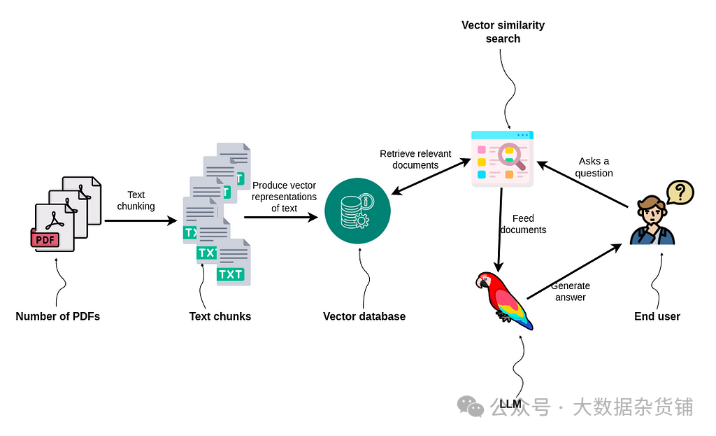 LLM 申请的检索增强方法 您可能使用过“与 PDF 聊天”等工具来搜索所提供文档中的信息。这些工具大多数使用向量相似性搜索来识别包含与用户问题相似的数据的文本块。实现很简单,如下图所示。