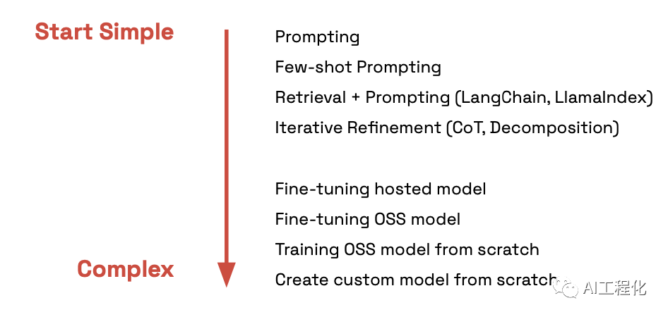 在实际的LLM开发中,也会先从简单入手,只有当简单无法完成需求时才会转而更复杂的方式去干预实现。
