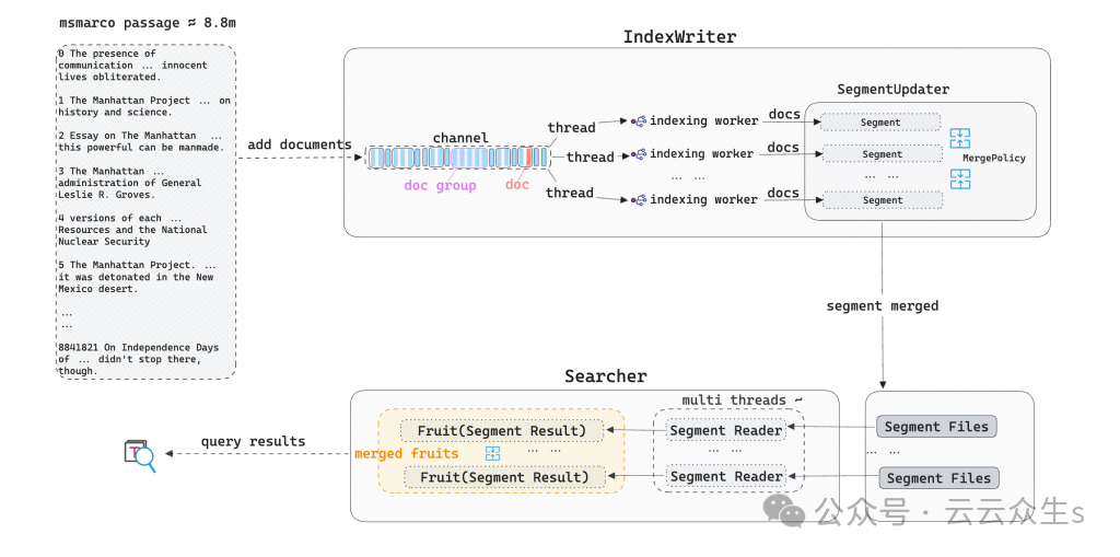 构建索引:Tantivy 对输入文本进行标记化,将其拆分为独立的标记。然后,它创建一个倒排索引(发布列表)并将其写入索引文件(段)。同时,Tantivy 的后台线程利用合并策略来合并和更新这些段索引文件。 执行文本搜索:当用户发起文本搜索查询时,Tantivy 解析查询语句,提取标记,并在每个段上根据查询条件和 BM25 相关性算法对文档进行排序和评分。最后,基于相关性分数合并这些段的查询结果并返回给用户。