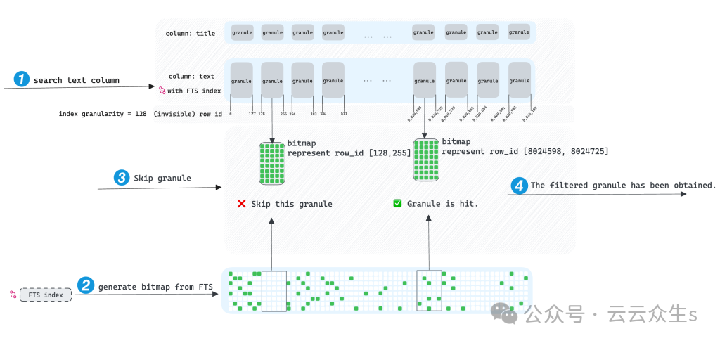 Tantivy 利用内存映射 (mmap) 访问段文件。这种方法不仅提高了并发搜索速度,还提高了索引构建效率。由于 Tantivy 无法直接将skp_idx_[index_name].data文件映射到内存,因此当用户发起需要 FTS 索引的查询时,MyScaleDB 将索引文件(.meta 和 .data)反序列化为 Tantivy 段文件到临时目录并加载 Tantivy 索引。Tantivy 通过内存映射加载这些反序列化的段文件,以便执行各种类型的文本搜索。因此,用户发起的初始查询请求可能需要几秒钟才能完成。 在我们的托管服务中,我们将 Tantivy 的段索引文件存储在 NVMe SSD 上。这减少了 I/O 等待时间,并提高了在需要随机访问和处理页面错误异常的情况下 mmap 的性能。 增强 ClickHouse 的原生文本搜索功能当对包含 FTS 索引的列发起带有过滤条件的请求时,MyScaleDB 首先访问 FTS 索引。它检索满足 SQL 过滤条件的列的所有行 ID,并将这些行 ID 存储在称为roaring bitmap的高级位图数据结构中。在遍历粒度时,它确定粒度的行 ID 范围是否与位图相交,指示是否可以删除粒度。最终,MyScaleDB 仅访问未被删除的粒度,从而实现查询加速。