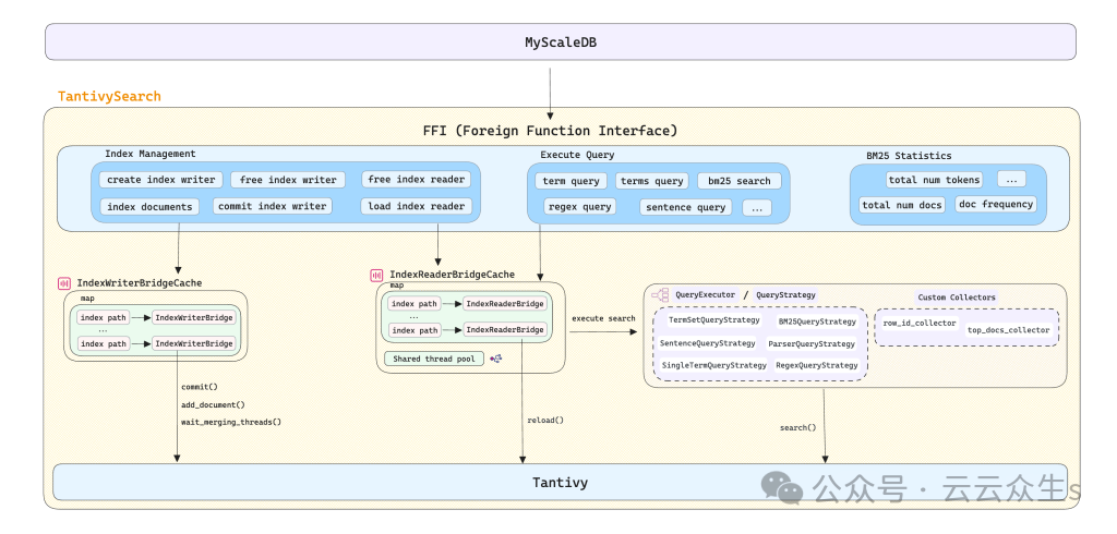有关更多功能,请参阅Tantivy 的文档。 无缝集成能力MyScaleDB 用C++编写,建立在 ClickHouse 的基础上,并作为人工智能原生应用程序的强大搜索引擎。为了丰富全文搜索功能,我们需要一个可以直接嵌入 MyScaleDB 的库。 Tantivy 是一个受 Apache Lucene 启发的全文搜索库。与 Elasticsearch、Apache Solr 和其他类似引擎不同,Tantivy 可以集成到各种数据库中,包括 MyScaleDB。由于 Tantivy 是用 Rust 编写的,因此可以使用Corrosion轻松地将其与 C++ 程序集成。 集成过程为 Tantivy 构建 C++ 封装器