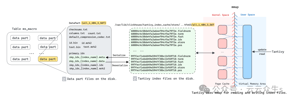 原始 Tantivy 库不能直接在 MyScaleDB 中使用。为了解决跨语言开发(C++ 和 Rust),我们开发了tantivy-search,一个 Tantivy 的 C++ 封装器。它为 MyScaleDB 提供了一组外函数接口 (FFI),支持直接管理索引创建、销毁、加载和灵活处理各种场景中的文本搜索要求。 在 ClickHouse 中将 Tantivy 实现为跳过索引ClickHouse 的跳过索引主要用于加速带有 WHERE 子句的查询。我们实现了一种名为全文搜索 (FTS) 的新跳过索引类型,以 Tantivy 作为底层实现。因此,对于 ClickHouse 中带有 FTS 索引的每个数据分区,我们都会为其构建一个 Tantivy 索引。为了减少每个索引需要存储在数据分区中的段文件数量,MyScaleDB 将这些段文件序列化为两个文件并将其存储在数据分区中。skp_idx_[index_name].meta文件记录每个段文件的名称和偏移量,而skp_idx_[index_name].data文件存储每个段文件的原始数据。