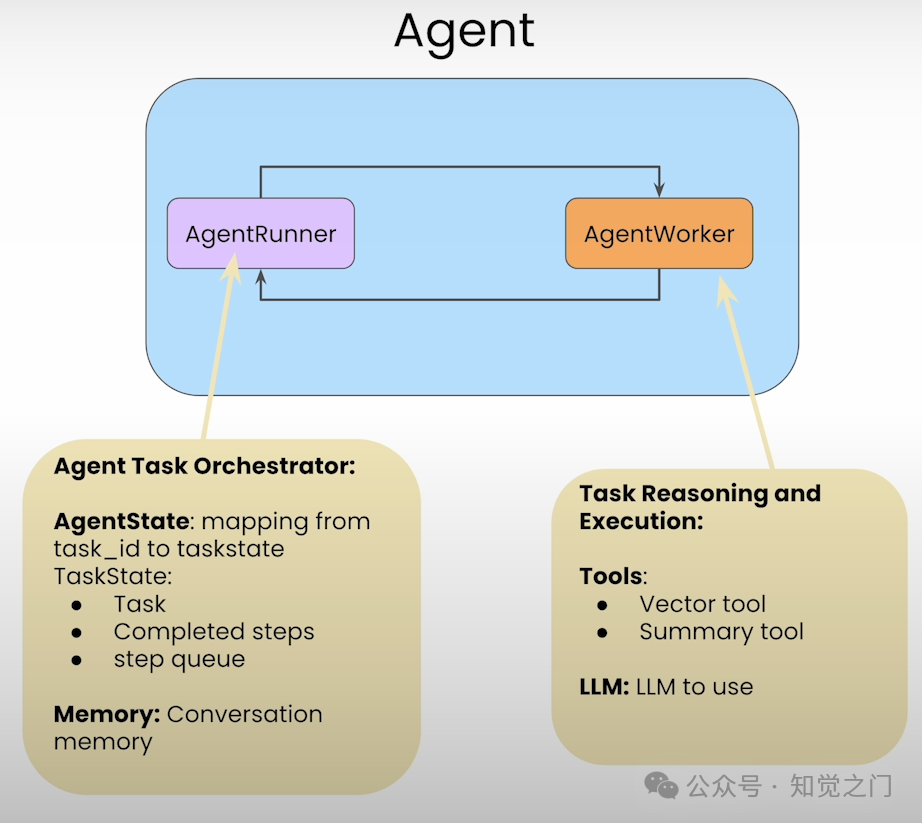 来源:llama index 代理架构在 LlamaIndex 中,代理包含两个组件: AgentRunner对象与AgentWorkers交互。 AgentRunners是协调器,它们存储: 状态 会话记忆 创建任务 维持任务 为每个任务运行步骤 展示面向用户的、高级的用户界面
