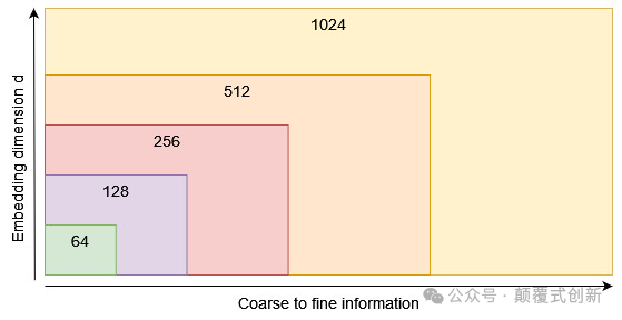 这导致了一个嵌入向量,其中包含了嵌套信息,最粗糙的信息存储在前几个维度中,而越来越多的细节存储在后面的维度中。