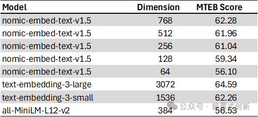 Nomic 的 Matryoshka 文本嵌入模型 nomic-embed-text-v1.5 是使用 matryoshka_dims = [768,512,256,128,64] 进行训练的。该模型可以在 Hugging Face 上获取。
