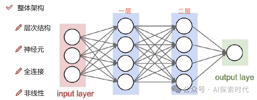 所以,就有了多层的神经网络架构,如下图所示,神经网络由多个神经层组成。如GPT-3就有96层。