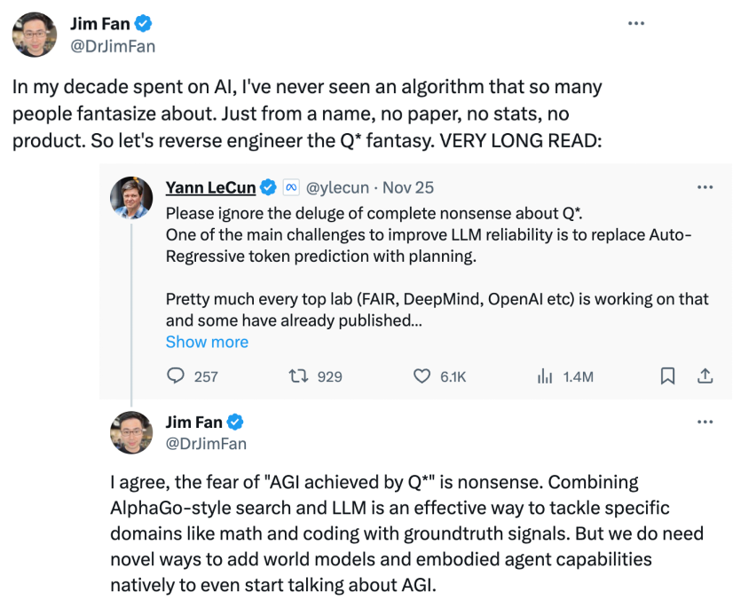 英伟达科学家Jim Fan、图灵奖得主Yann LeCun等 参与讨论OpenAI的Q*实现方式 Meta科学家田渊栋则认为Q*是Q-learning和A*的结合 且天然地适合推理任务,尤其在数学推理方面