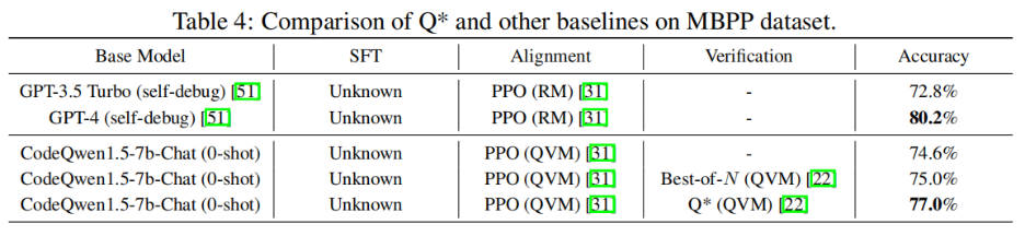 为了获得状态-动作对(s_t, a_t)的最优Q值以实现规划,研究人员在当前LLM策略生成的数据上通过监督学习的方式训练了一个代理Q值模型 ingFang SC", "Hiragino Sans GB", "Microsoft YaHei UI", "Microsoft YaHei", Arial, sans-serif; font-size: var(--articleFontsize); letter-spacing: 0.034em; width: 20px;"/>。训练过程中的真实标签 ingFang SC", "Hiragino Sans GB", "Microsoft YaHei UI", "Microsoft YaHei", Arial, sans-serif; font-size: var(--articleFontsize); letter-spacing: 0.034em; width: 56px;"/>可以由三种不同的方式得到,包括离线强化学习,蒙塔卡罗采样估计和利用更强大的语言模型补全。 实验结果表明,昆仑万维本次所提出的Q*框架,可以显著地提升LLM的推理能力,在GSM8K数据集上,Q*帮助Llama-2-7b提升至80.8%的准确率,超越了ChatGPT;在MATH数据集上,Q*帮助DeepSeek-Math-7b提升至55.4%的准确率,超越了Gemini Ultra; 在MBPP数据集上,Q*帮助CodeQwen1.5-7b-Chat提升至77.0%的准确率,缩小了与GPT-4的编程水平差距。