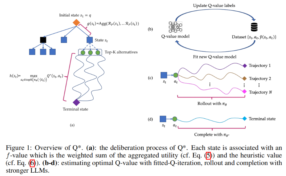 在《Q*: Improving Multi-step Reasoning for LLMs with Deliberative Planning》论文中,研究人员首先将大语言模型的推理轨迹分解为若干个状态,对于每一个状态,参考DeepCubeA中的设计,通过将定义Path Cost的g(s_t)函数和定义Accumulated Reward的Q*(s_t, a_t)集成到同一个f(s_t)函数内,实现了对历史状态收益和未来期望收益的综合考虑。最后利用A*搜索算法对状态进行最佳优先搜索,实现了对复杂推理任务的全盘规划,从而提升开源模型在推理任务上的性能。