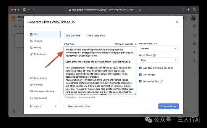 步骤5:选择一个演示主题并进行任何自定义 步骤6:点击 “Create Slides”,SlidesAI 将根据您的文本生成演示文稿