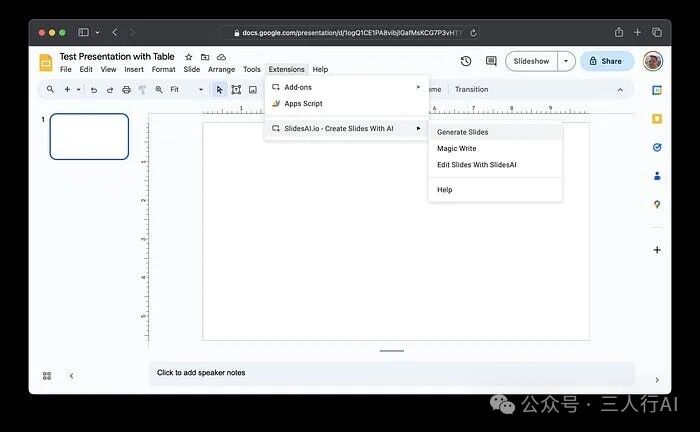 安装 SlidesAI 插件 步骤2:在 Google 幻灯片中,点击 SlidesAI 插件