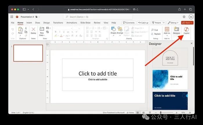 Microsoft Copilot for Office 步骤2:在顶部面板中选择 “Designer” 按钮旁边的 “Copilot” 按钮