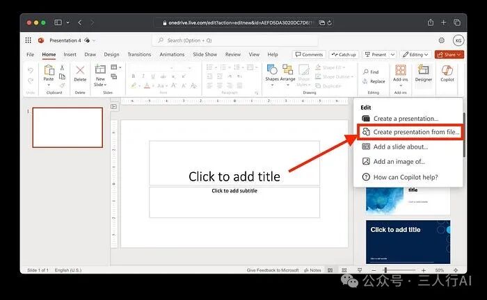 Copilot 按钮在 PowerPoint 中 步骤3:点击 “Create presentation from file”