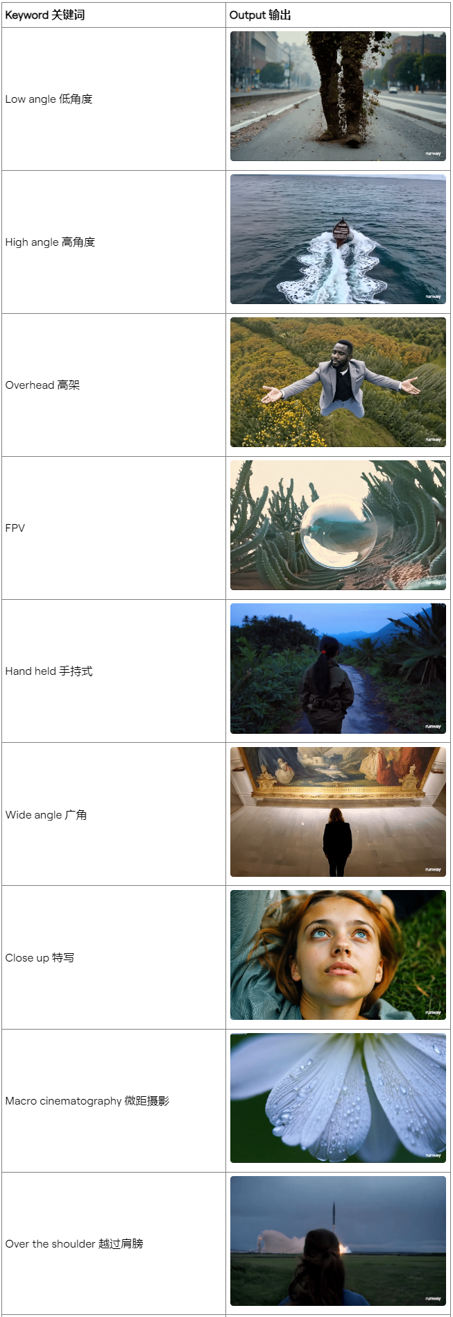 Prompt Keywords 提示关键词Keywords can be beneficial to achieve specific styles in your output. Ensuring that keywords are cohesive with your overall prompt will make them more apparent in your output. 关键字有助于在输出中实现特定的样式。确保关键字与整体提示一致将使它们在输出中更加明显。 In example, including keywords about skin texture wouldn't be beneficial to a wide angle shot where the camera is not closely focused on a face. A wide angle shot might instead benefit from additional details about the environment. 例如,包含有关皮肤纹理的关键字对于相机没有紧密聚焦在脸部的广角镜头没有好处。相反,广角镜头可能会受益于有关环境的更多细节。 While keeping this cohesiveness in mind, below are different keywords you can experiment with while drafting your prompts. 在牢记这种凝聚力的同时,您可以在起草提示时尝试使用以下不同的关键字。 1、Camera Styles 相机风格