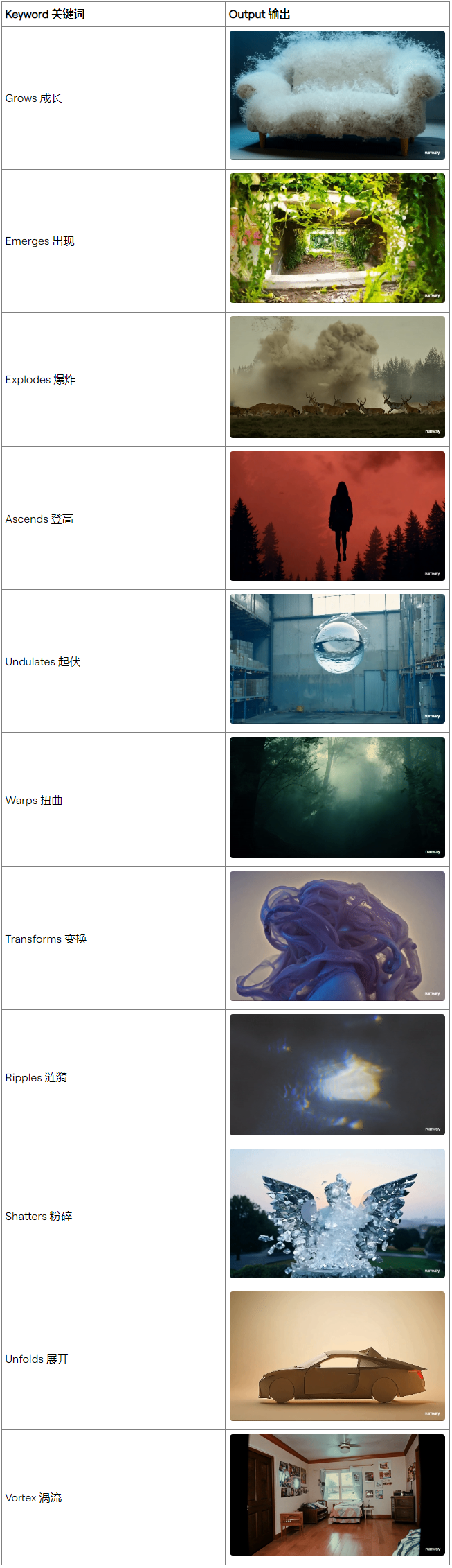 以下整理了Runway官方出的提示词指南,如果你关注使用AI视频工具,值得好好反复学习,值得收藏: Gen-3 Alpha has endless potential to bring your artistic vision to life. Creating a strong prompt that conveys the scene is the key to generating video aligned with your concept. Gen-3 Alpha 具有无限的潜力,可以将您的艺术愿景变为现实。创建传达场景的强烈提示是生成符合您的概念的视频的关键。 This article covers different example structures, keywords and prompting tips to help you get started with Gen-3 Alpha. These are just examples – don’t be afraid to experiment when bringing your ideas to life. 这份指南涵盖了不同的示例结构、关键字和提示技巧,以帮助您开始使用 Gen-3 Alpha。这些只是示例——在将您的想法变为现实时,不要害怕进行实验。
