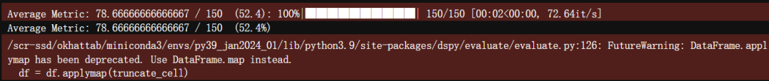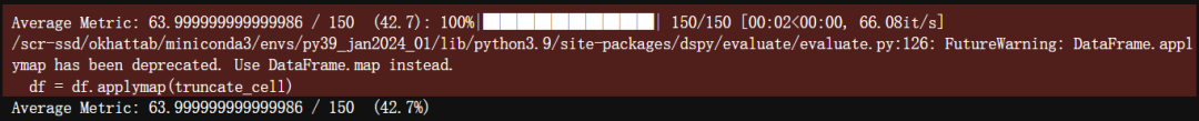 LangChainModule集成自dspy.Module,因此可以被优化器优化,此外LangChainModule实现了invoke方法,与Langchain的使用习惯一致。 至此,我们已经得到了一个被DSPy修饰过的LangChain的链。接下来,我们可以使用优化器来优化这条链。在优化之前,我们先利用Metrics 计算zero_shot 在特定数据集上的准确率:fromtweet_metricimportmetric,trainset,valset,devsetevaluate=Evaluate(metric=metric,devset=devset,num_threads=8,display_progress=True,display_table=5)evaluate(zeroshot_chain)  结果为42.7%,在150个测试的问题中,有64个是回答符合Metrics的。接下来,利用优化器进行优化,并再一次调用 evaluate函数进行验证,如下面代码和图片所示:# Set up the optimizer. We'll use very minimal hyperparameters for this example.# Just do random search with ~3 attempts, and in each attempt, bootstrap <= 3 traces.optimizer = BootstrapFewShotWithRandomSearch(metric=metric, max_bootstrapped_demos=3, num_candidate_programs=3)