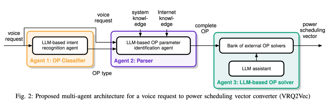 研究提出了一种新颖的多代理架构,以将用户的语音请求转换为电力调度向量。该架构包括三个主要组件:LLM意图识别代理(Agent 1)负责将用户请求分类为适当的优化问题(Optimization Problem,OP)类型;LLM OP参数识别代理(Agent 2)从用户请求和系统知识中提取所需的参数信息;LLM OP求解代理(Agent 3)利用外部求解器和LLM辅助来解决建模的优化问题。图1展示了这种多代理架构的设计。