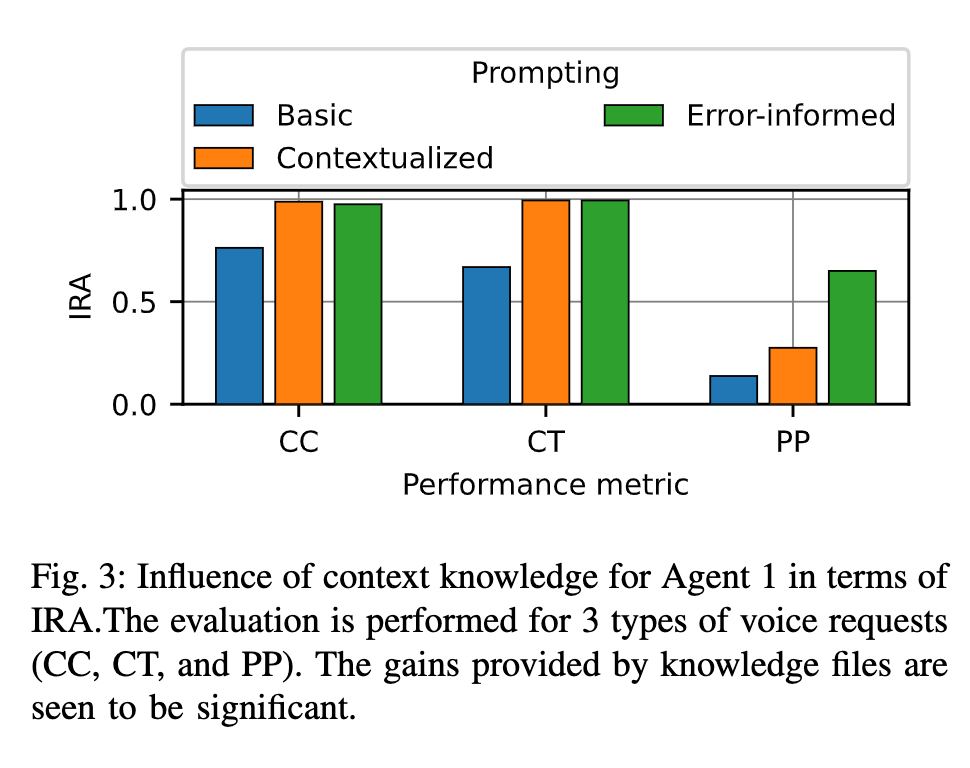 实验结果表明,错误信息提示在所有性能指标中都达到了最高的IRA。通过提供典型的电动汽车充电问题,上下文化提示相对于基本提示显示出适度的改进,而后者与应用无关。图3展示了不同提示工程技术对Agent 1在IRA方面的影响。