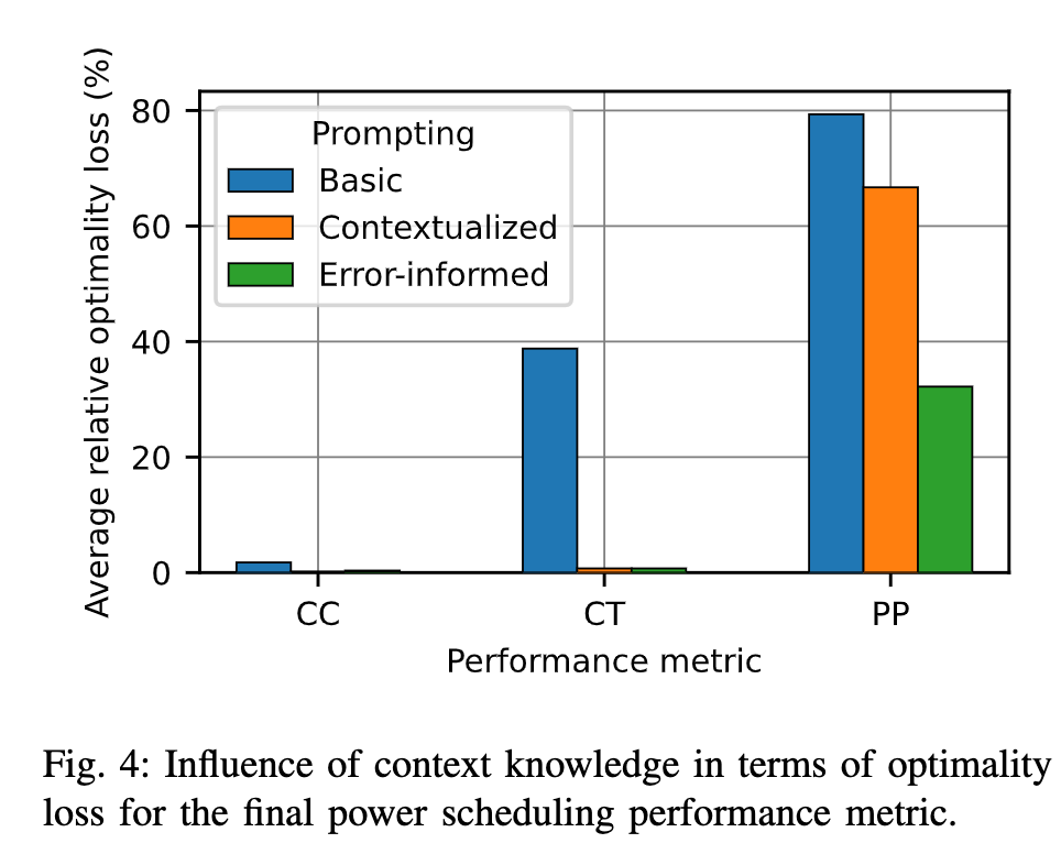 图4进一步证实了这些结果,错误信息提示表现出最低的平均最优性损失,表明最准确的问题建模。这两个图证实了在底层框架中利用先进提示技术的优势,以显著提高模型准确分类请求的能力,并在最终充电功率向量方面引入改进的准确性性能。