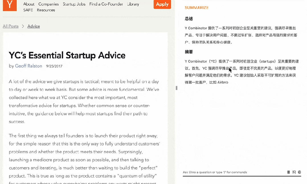 对了,Elmo(v0.3.0)支持在总结中索引网页原文,点击可以直接移动到对应的网页内容,左右对照查看。