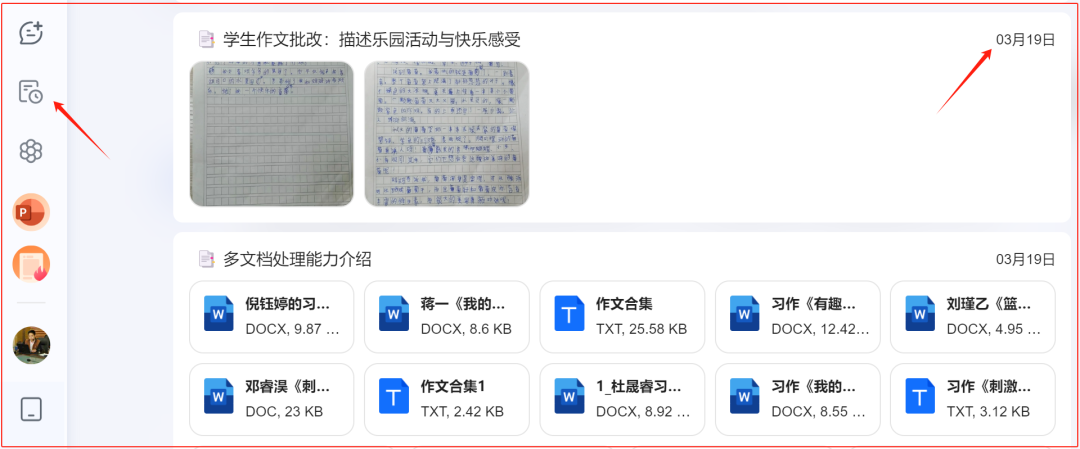 我们经常找不到自己的文档放在哪儿,但一定记得自己把文档在微信上传给了哪一个人。Kimi也可以当作一个机器人,下面这是课件老师自使用它以来,用文档让它处理的记录,注意时间是今年的3月19日,这些作文是可以下载的,它可以用来充当我们的文件管理器。