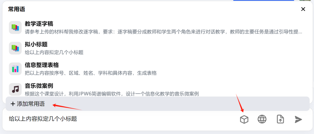 例如:课件老师便把生教学逐字稿、拟定小标题、生成音乐微案例和修改作文的提示词设置成了常用语。分享两个提示词给大家: