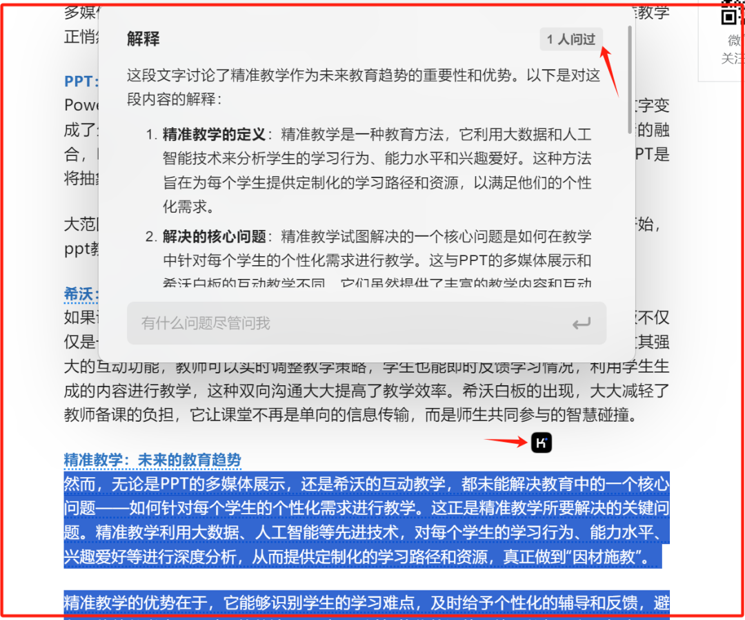 选中文字后,点击黑色的kimi logo,它就可以生成解释文字。