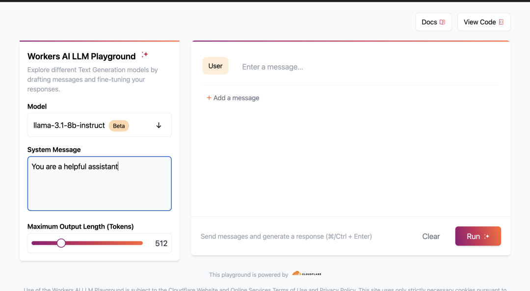 上图右边是调用API示例。 请注意,你需要一个API密钥才可以,更多信息可以查看官网文档,这部分适合开发者。 与此列表中的其他平台不同,Fireworks AI支持Llama 3.1发布的所有模型。 5. Cloudflare PlaygroundCloudflare是互联网上最大的网络平台之一。人们使用Cloudflare服务来提高其网站和服务的安全性和性能。 最近,他们推出了一个AI运用,允许用户探索不同的文本生成模型。你前往Cloudflare Playground,选择模型并开始聊天。