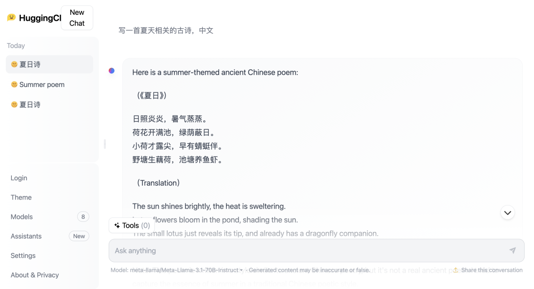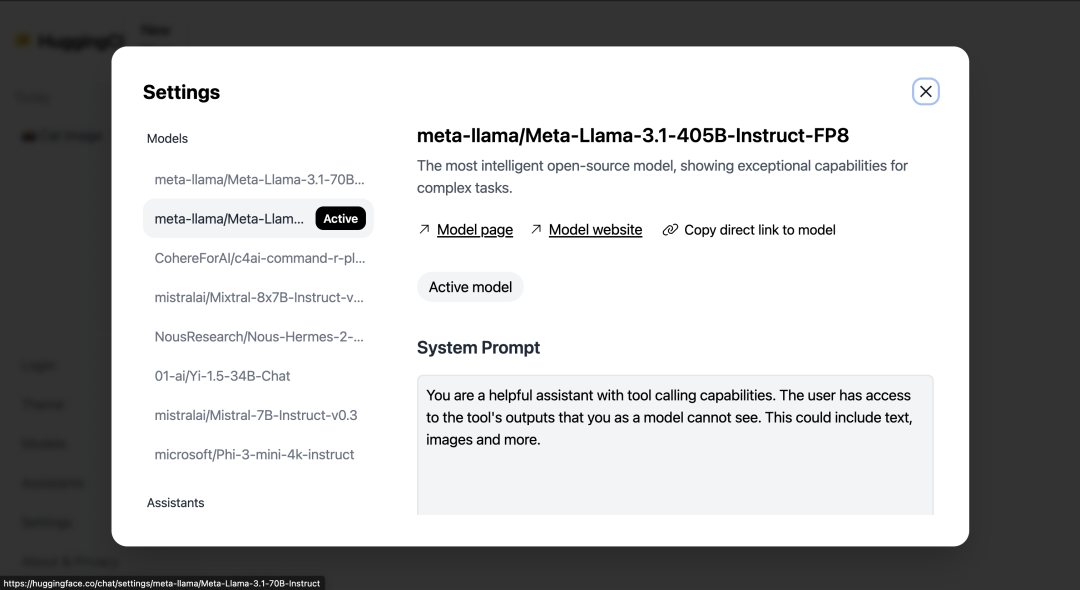 已经学过你的AI生产力工作坊二期的同学已经很熟悉这个操作了,可以结合课程讲过的技巧,进行更多尝试,欢迎在群内分享。 2. HuggingChatHuggingChat是由Hugging Face开发的开源AI聊天机器人。Hugging Face是一个用户可以托管生成式AI模型的平台。 要开始使用,请访问Hugging Chat并创建账户。 网址:https://huggingface.co/chat/ 在设置页面中激活meta-llama/Meta-Llama-3.1–405B-Instruct-FP8模型。