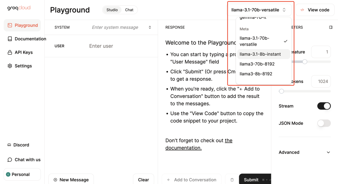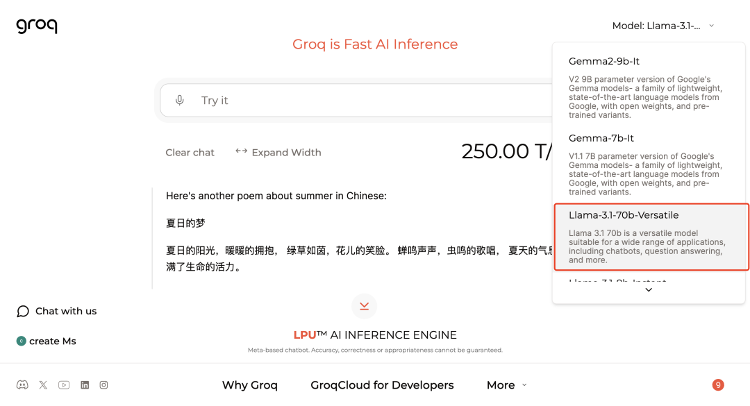 3. GroqGroq因其专门设计用于加速AI推理工作负载的硬件和软件而闻名,Llama 3.1目前已经在Groq Playground上托管。