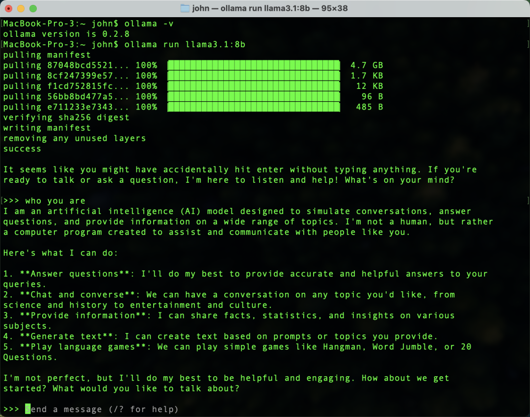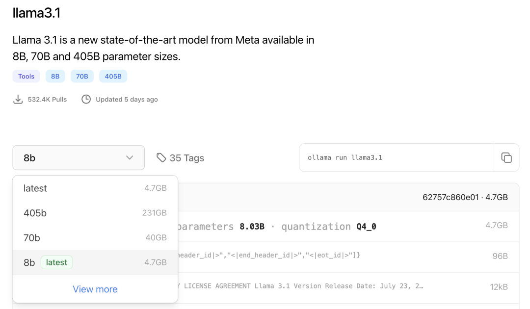 让我们开始吧。 ingFang SC";letter-spacing: normal;text-wrap: wrap;text-align: justify;line-height: 1.75;font-size: 16.8px;font-weight: bold;display: table;margin: 4em auto 2em;padding-right: 0.2em;padding-left: 0.2em;background: rgb(1, 155, 252);color: rgb(255, 255, 255);">OllamaingFang SC", "Hiragino Sans GB", "Microsoft YaHei UI", "Microsoft YaHei", Arial, sans-serif;margin: 1.5em 8px;letter-spacing: 0.1em;color: rgb(63, 63, 63);text-align: justify;">Ollama是一个先进的AI工具,允许用户轻松地在本地机器上设置和运行大模型。ingFang SC", "Hiragino Sans GB", "Microsoft YaHei UI", "Microsoft YaHei", Arial, sans-serif;margin: 1.5em 8px;letter-spacing: 0.1em;color: rgb(63, 63, 63);text-align: justify;">先下载并安装Ollama。在终端运行ollama -v,查看是否安装成功。 ingFang SC", "Hiragino Sans GB", "Microsoft YaHei UI", "Microsoft YaHei", Arial, sans-serif;margin: 1.5em 8px;letter-spacing: 0.1em;color: rgb(63, 63, 63);text-align: center;">官网:https://ollama.com/ingFang SC", "Hiragino Sans GB", "Microsoft YaHei UI", "Microsoft YaHei", Arial, sans-serif;margin: 1.5em 8px;letter-spacing: 0.1em;color: rgb(63, 63, 63);text-align: justify;">安装完成后,下载相应的Llama 3.1版本,安装的版本,根据你的电脑性能选择。运行4050亿参数模型需要的硬件成本很高,因此我建议先尝试80亿参数模型。