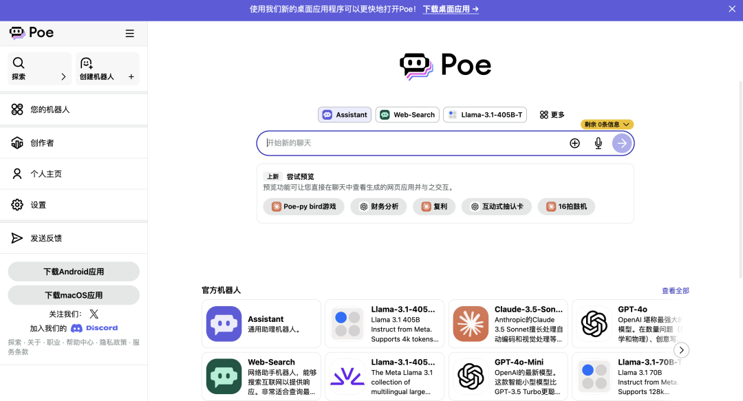 地址:https://playground.ai.cloudflare.com/ 这个平台也是免费的,甚至不创建账户就可以使用。 其他:Poe.comPoe绝对是免费体验新Llama模型的最佳方式之一。只需访问官网并创建一个账户就可以使用。 但是Poe每天赠送3,000个免费积分,只能发送6条免费消息。 官网:https://poe.com 在官方机器人部分,找到Llama-3.1–405B-T机器人,打开它即可开始与Llama 3.1聊天。该机器人由Together.ai托管。