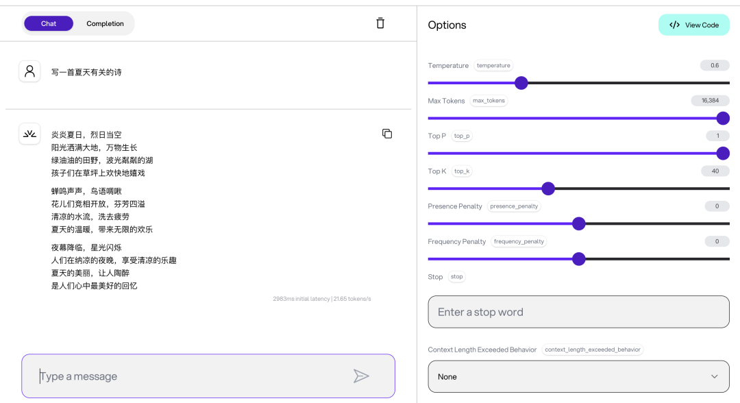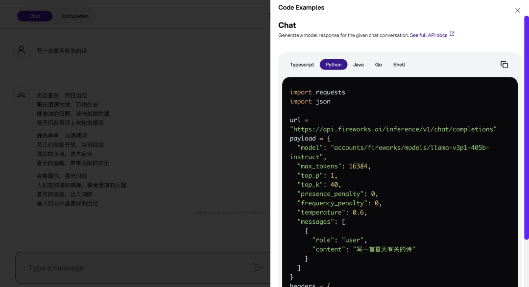 页面:https://fireworks.ai/models/fireworks/llama-v3p1-405b-instruct 你可以在右边部分调整参数设置,并使用你的配置调用API。