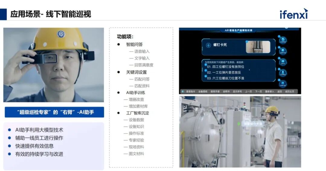 该场景以问答为主,问答是文本类的加多模态数据,包括文字、视频、三维模型数据,提前帮助工厂构建数据库。但目前体量较小,由于工厂以前的智能问答都基于原有的数据。另外一部分数据是线上收集的实时数据,数据库在系统集成过程中是不断增长的。利用大模型技术为一线员工进行操作,实现智能问答、关键词设置、AI助手训练等,能够快速为员工提供有效信息,并持续学习与改进。 培训场景相对与生产环境相对友好,会把企业的知识信息输入到系统中,将设备的全部信息包括状态、操作历史等以实景结合的形式进行展示与交互。替代老师傅的传授功能,给部分新员工进行整体培训,相比较传统的培训更加直观、易学、节约时间,提高了新人培训的效率。强化训练效果,结合情况提供合适的情景训练,边学边做,实践结果反馈于训练过程。指导员工的流程性操作,保障安全性与规范性,提升工作质量。并且帮助企业不断沉淀数字化内容,形成自有知识库。以上是工业现场环境中,空间智能应用较为成熟的几个落地场景。但是过程中还有很大的提升空间,人工智能大模型技术的出现,能为我们提供更多的想象力,把整套系统建设得更更完善、更智能。 |