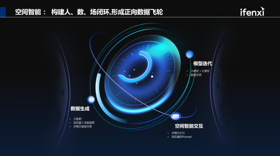 以上也是目前人工智能在精确度要求不高、娱乐交互场景用得更多的原因,因为那些场景的容忍度相对较高。基于以上问题,我们有一套解决思路。因为大模型需要迭代并非一蹴而就的,当系统搭建后,需要进行整体优化。所以结合空间智能应用场景,构建“人、数、场”闭环,可以形成正向数据飞轮。
