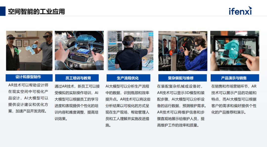 上图介绍了空间智能的典型应用场景,其中设计和原型制作是目前大模型在工业应用中,探讨热度较高的方向。从执行的角度,对于装配维修、设备运维场景的探索较多,这部分距离生产很近,也是工厂较关注的方向,但难度较大。