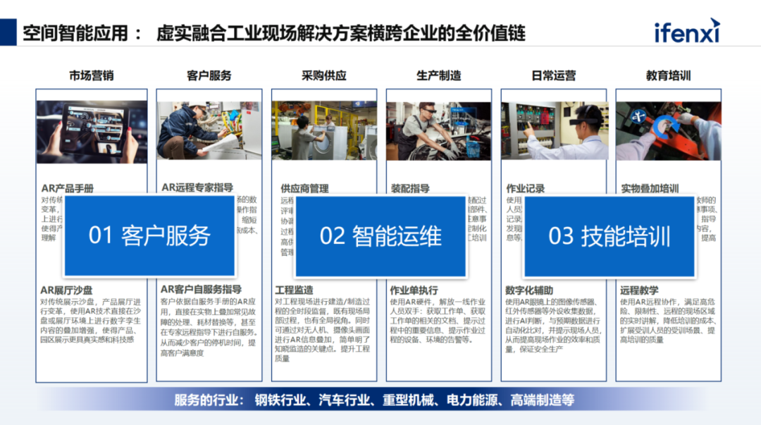 空间智能在过去已经落实到工业的多个应用场景,涵盖了工业生产大部分流程,其中包含客户服务类、运维、技能培训三大类,应用场景非常广泛。ingFang SC", "Hiragino Sans GB", "Microsoft YaHei UI", "Microsoft YaHei", Arial, sans-serif; letter-spacing: 0.544px;">02