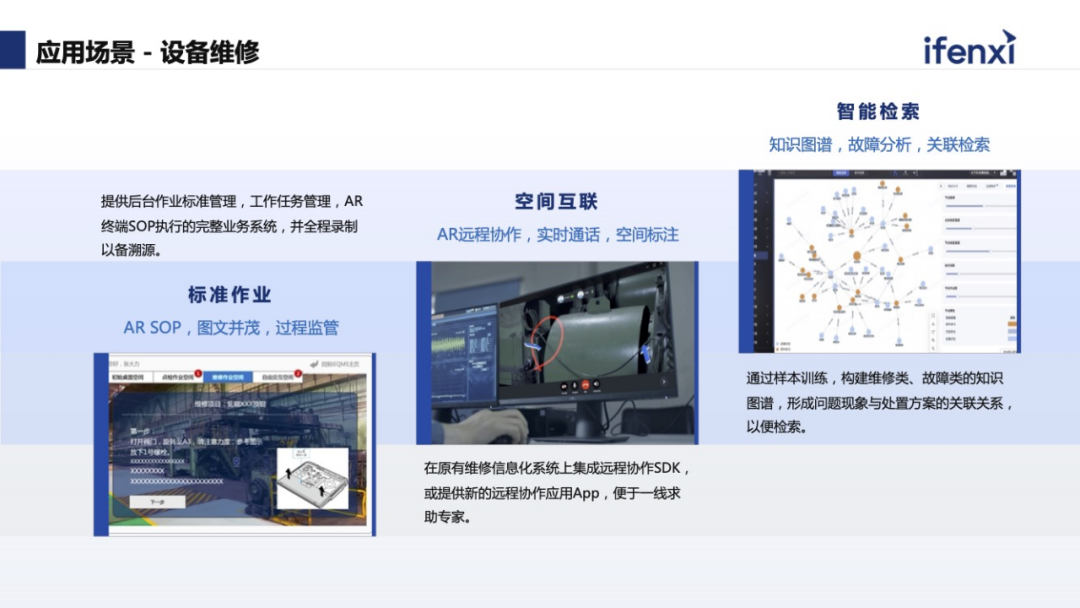 互联网发展目前经历了三阶段:PC 互联网、移动互联网、空间互联网。第一阶段以文档数据为主,第二阶段随着视频图像的增多,有了二维数据,第三阶段逐渐变成三维可视化数据,同时会有 AIGC 的数据生成,数据会随着互联网的服务方式的改变不断迭代升级。结合该背景,工业的生产环境也在迎合基础变化,加入物联网、大数据、人工智能一系列技术构建基础底座。现在有了新技术、新方法,能达到更高的层级,整个工业发展往智能化方向做转型。所谓空间智能大概是什么样子?可实现操作人员跟现场进行多种多样的交互,能把很多虚拟化信息直接展现在现场空间。通过佩戴智能可穿戴设备,能看到现场留下的信息,实现所见即所用,直接在前端交互。将数据和知识留在现场是核心概念,在现实物理空间查看知识,不必再去到后端查阅,这是我们所描绘的比较完整的空间智能应用场景。