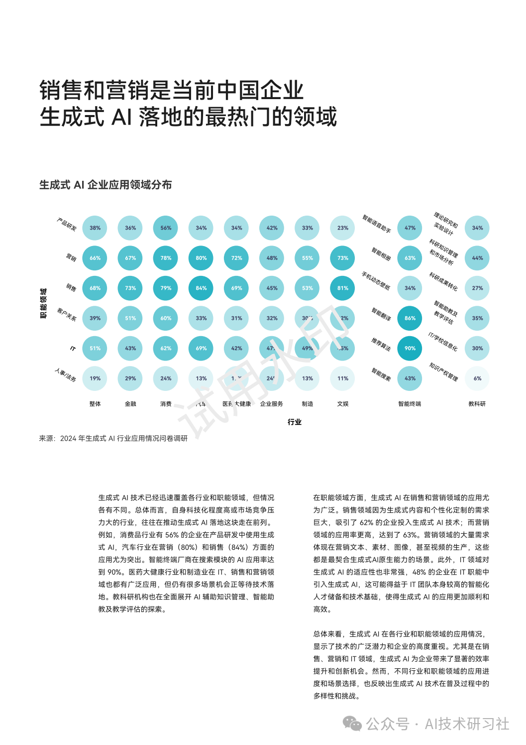 总体来看,生成式AI在各行业和职能领域的应用情况,显示了技术的广泛潜力和企业的高度重视。尤其是在销售、营销和IT领域,生成式AI为企业带来了显著的效率提升和创新机会。然而,不同行业和职能领域的应用进度和场景选择,也反映出生成式AI技术在普及过程中的多样性和挑战。
